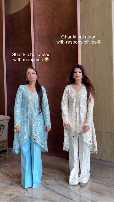 This baby blue/ivory/blush pink color option indo-western is soft pure imported cutwork with mirror and pearl tassles and fringes on sleeves. Pure silk pants with handwork Neevah’s stitching is haute couture designer level with full pasting Its the highest quality in the market