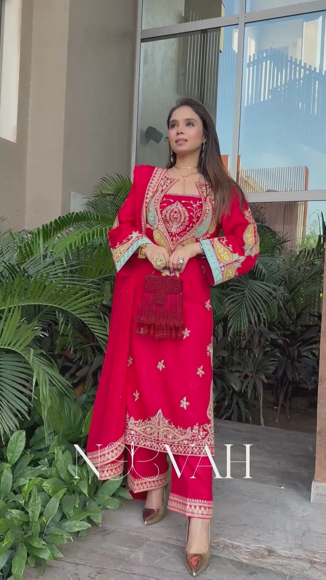 This 4 pc pure suit has a shirt , a pant , a bustier , and a dupatta all pure silk The embriodery design is an original. The delicate embriodery is all hand and machine work. Originally in red it can be done in colors. Neevah’s stitching is haute couture designer level with full pasting Its the highest quality in the market