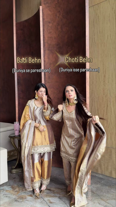 This 100% pure silk tissue suit Is 3 pc Shirt and pant is heavily Embellished at borders Pure silk organza designer dupatta Neevah’s stitching is haute couture designer level with full pasting Its the highest quality in the market