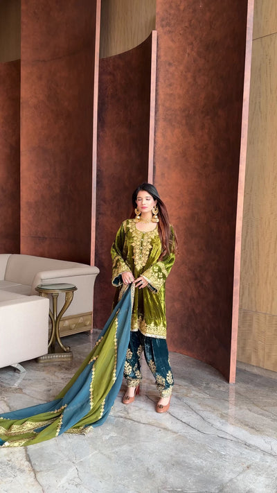 This pakistani style pure velvet outfit is a 3 pc set -dupatta is all embridoered pure organza -shirt is embriodered pure velvet -bottom is embriodered pure velvet This green 3 pc suit is pure supersoft velvet silk all hand embroideries On shirt ,sleeves and pants. Pure organza silk dupatta Neevah’s stitching is haute couture designer level with full pasting Its the highest quality in the market